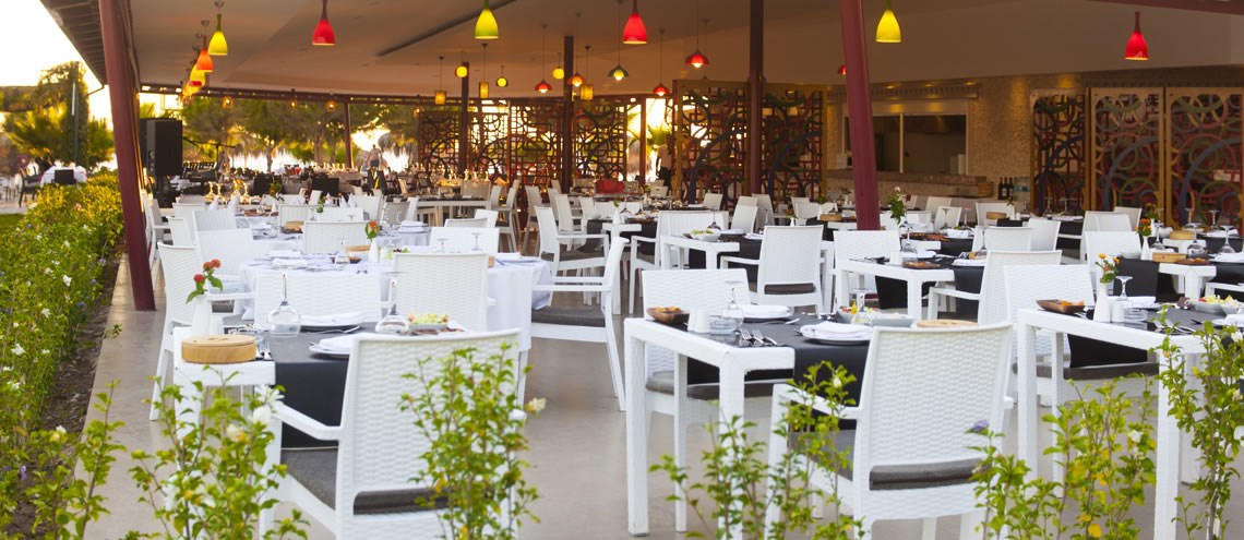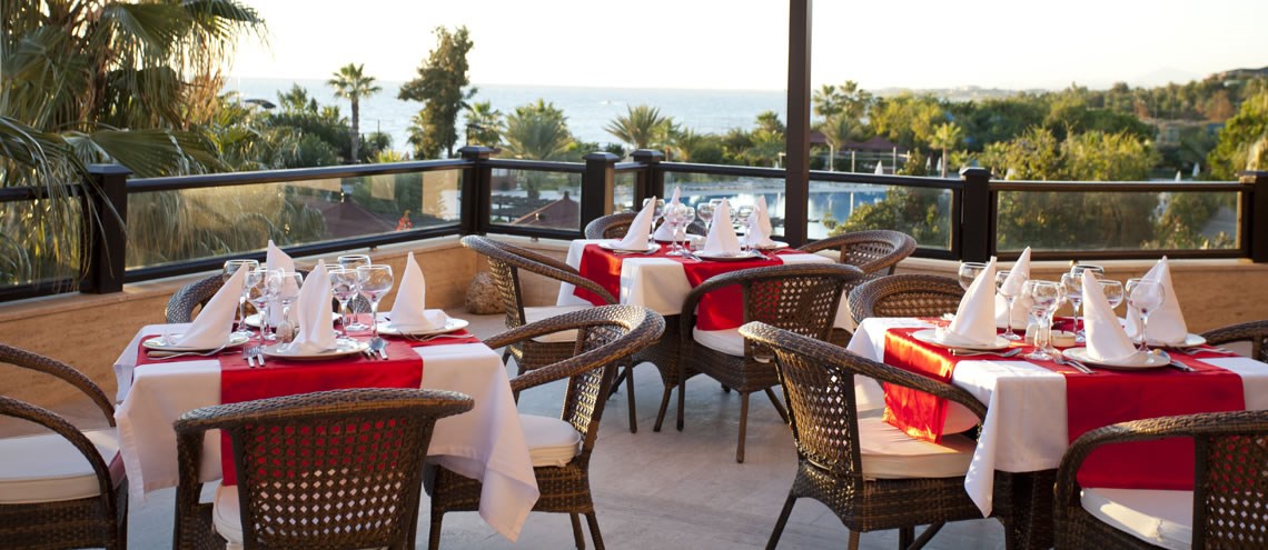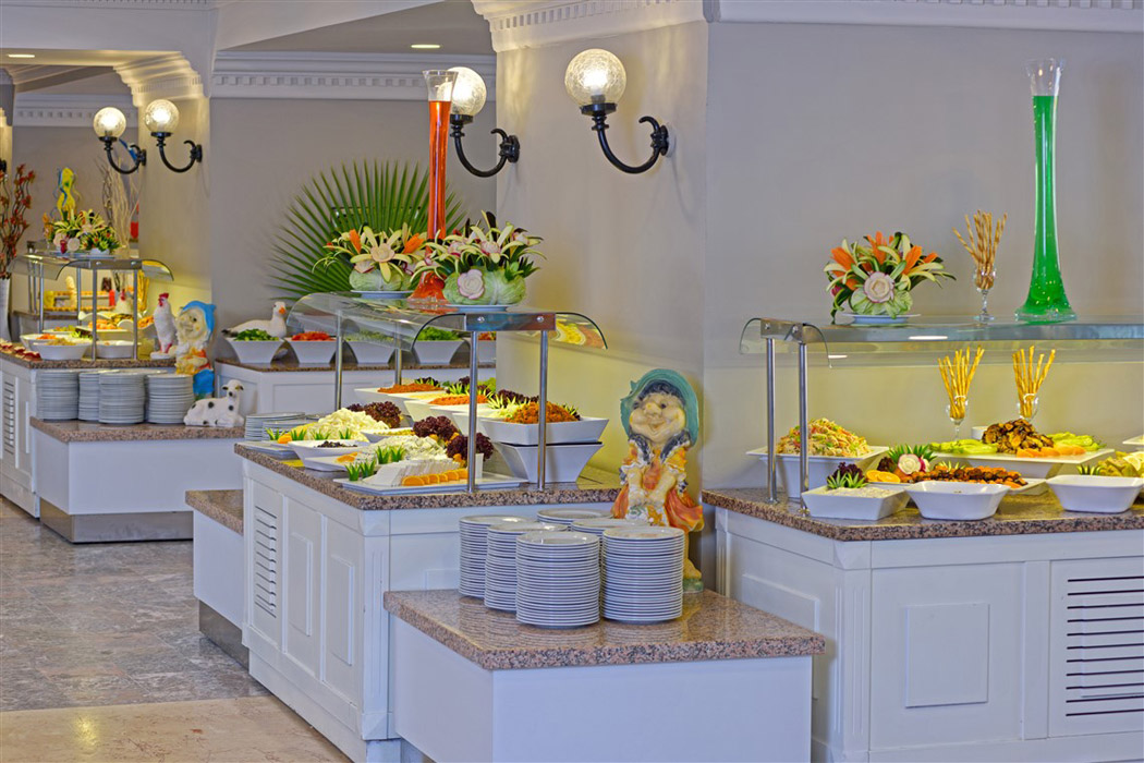 Her Şey Dahil Sabah kahvaltısı, öğle ve akşam yemekleri açık büfe, Geç kahvaltı, snack servisler (salata, hamburger, pizza), Gözleme, simit, kahve ve pasta servisi, gece çorbası, Odalarda minibar (haftada 2 kez soft içecekler ile yenilenir), 5 adet ücretsiz ve rezervasyonlu a la carte restaurant (deniz, Türk, İtalyan, Uzakdoğu, Meksika, konaklama süresince 1 kez ücretsiz), Tesisin belirlediği alkollü ve alkolsüz içecekler (10:00-00:00), Disko barda (00:00-01:30).